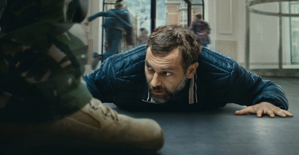So, Ilian drops by the Apple store, but unlike regular shops where you simply pick up items off the shelves and swiftly checkout, here things work differently. You must navigate through 15,000 square feet of minimalistic open space before speaking with an underpaid staff member pretending to be overly cheerful, after which they retrieve your desired product from a hidden storeroom accessible only via a doorknob-less entryway. Now, let me get back to my story—yes, right—Ilian requires some fresh AirPods and finds himself standing at one of their counters as this guy, whom we come to know as Ammar (played by Soufiane Moussouli), storms into the place waving a firearm around, firing several rounds towards the roof and declaring dominion over the area. Panicked customers rush upwards toward upper floors, hide inside cabinets, flee outdoors; meanwhile, the pair of police officers stationed externally request additional support and assist in evacuating everyone nearby.