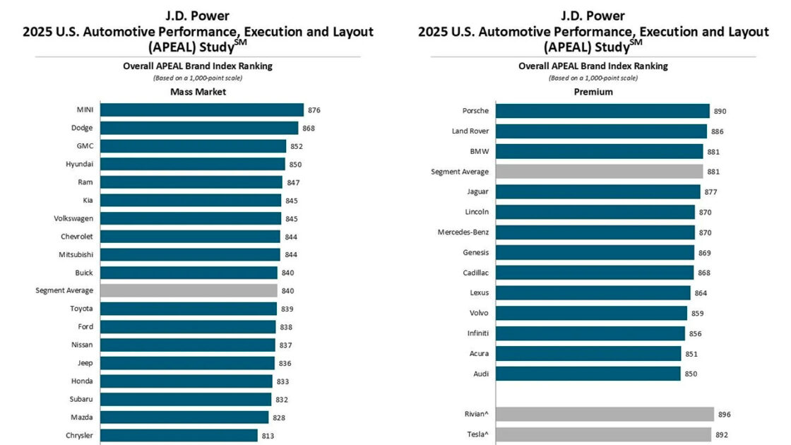 An automobile manufacturer received the top rating among U.S.-based brands in the 2025 J.D. Power Automotive Performance, Execution and Layout (APEAL) Survey and ranked second within mainstream brands behind Mini. This research focuses more on the feelings and enthusiasm experienced by vehicle owners after owning the car for 90 days rather than on reliability.