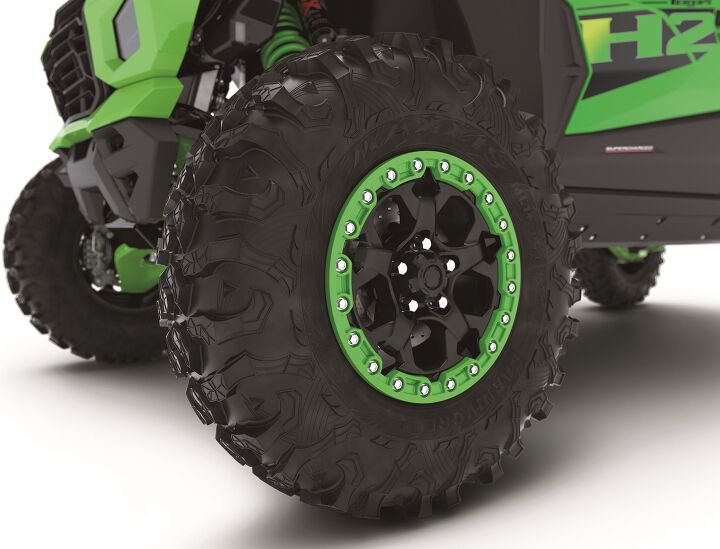 The Teryx4 H2 and Teryx5 H2 feature traction provided by 33-inch MAXXIS Carnivore Plus tires. These were created in collaboration with Kawasaki exclusively for H2 applications, and the off-road rubber compounds are fitted onto 16-inch aluminum rims. The H2 Deluxe versions include beadlock wheels to better avoid punctures.