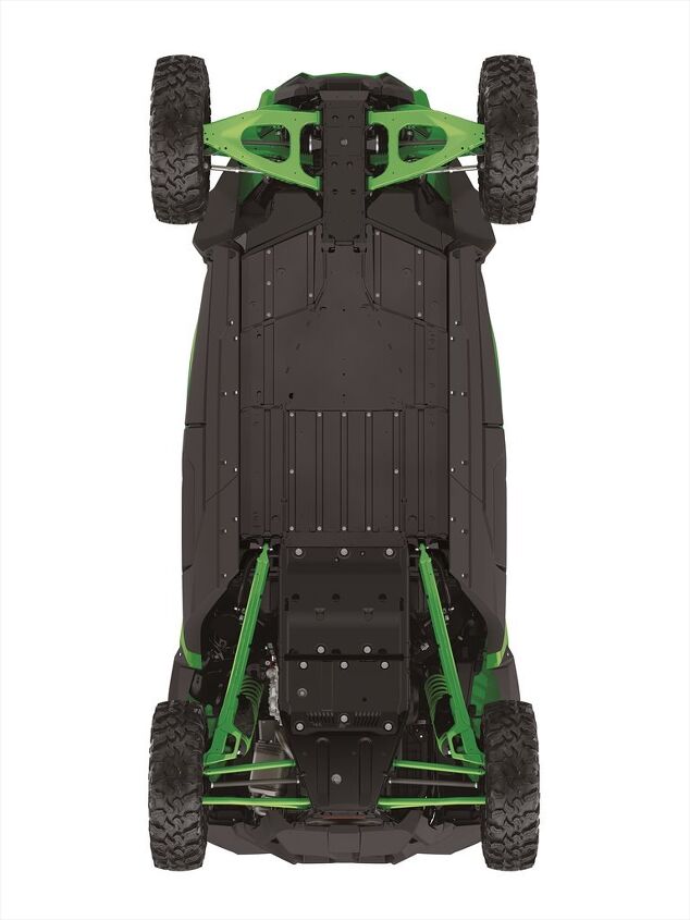 The performance of a UTV depends greatly on its chassis, and Kawasaki has gone above and beyond with the H2 model. Central to its design is a frame that integrates the Rollover Protection Structure (ROPS) as part of the main structure. Additional support comes from wheels placed at the extreme edges, enhancing stability and grip thanks to the 126-inch wheelbase and 74-inch width. This setup allows the Teryx H2s to achieve approach and departure angles exceeding 90 degrees, along with a 34-degree breakover angle. The ground clearance measures up to 16.1 inches, and durable skid plates cover the entire underside.