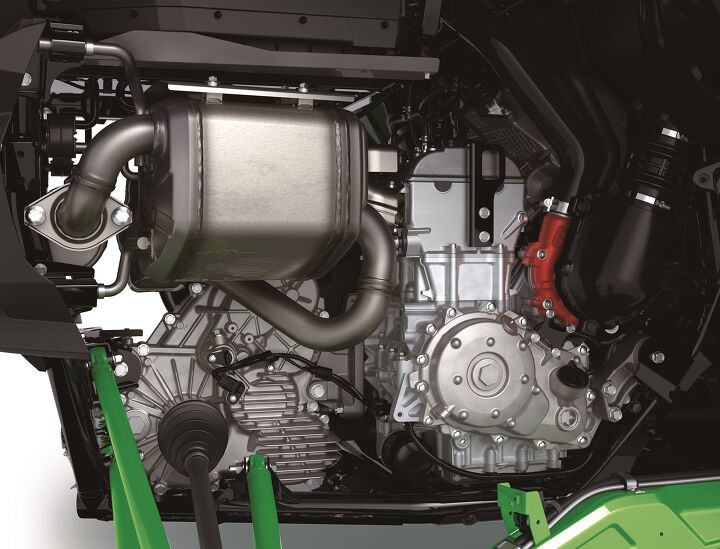 The engine achieves maximum power above 9,000 RPM (with a redline of 9,500 RPM), and a continuously variable transmission transfers this power to either two or four driving wheels. The vehicle features twin snorkel intakes designed to optimize airflow into the engine, placed strategically so that dust flows around the entry points. According to Kawasaki, the incoming air speed can reach as high as 223 mph, and it can also boost air pressure to 2.4 times the normal atmospheric level.