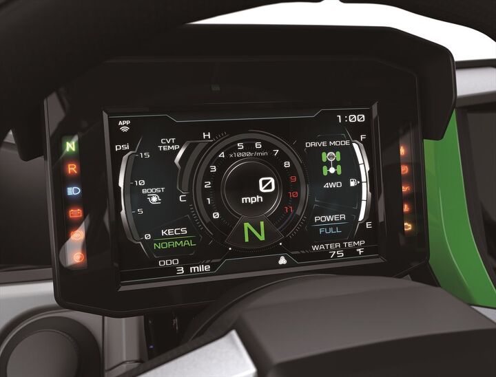 This display configuration can also track KECS operations related to the suspension system, and the unit was engineered to reduce reflections. Standard instrument panel features such as the speedometer, trip meter, fuel level indicator, gear position, timepiece, CVT temperature, boost pressure, and others are all included in this area. Smart device integration is available through the "RIDEOLOGY THE APP POWERSPORTS" application.