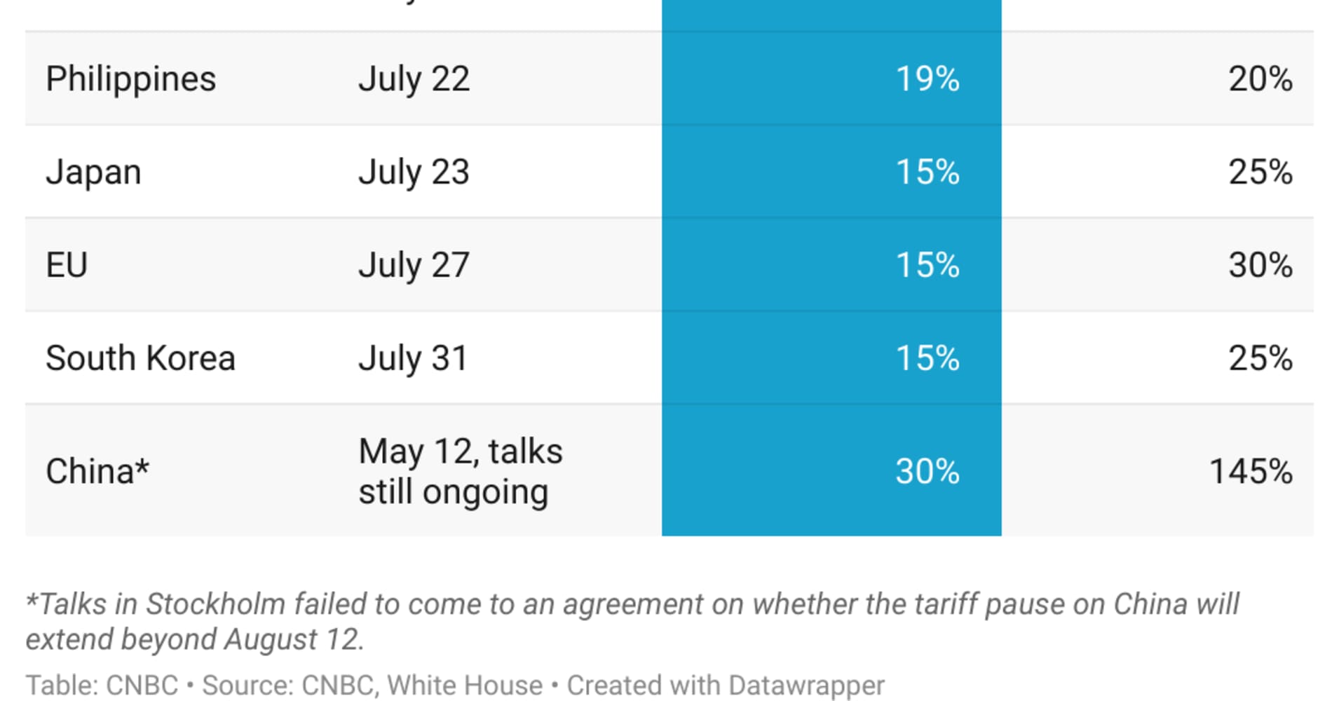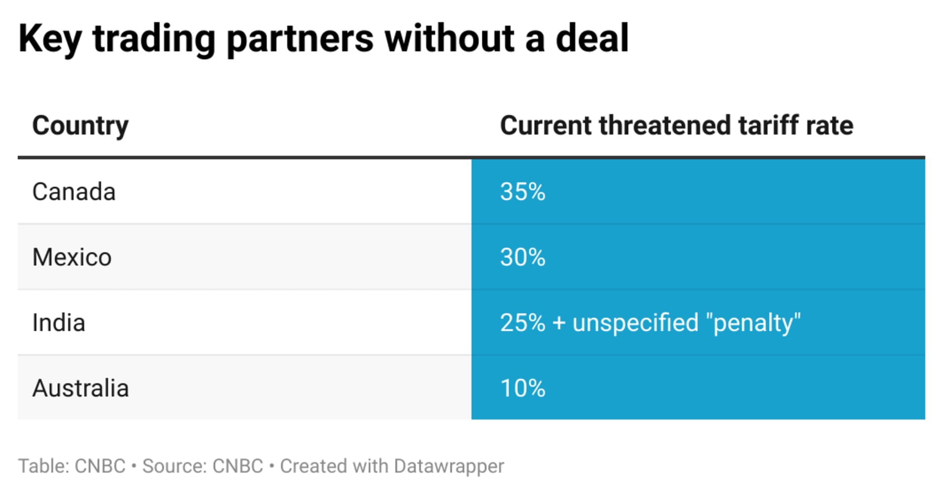 - Major trade allies who have not yet reached an agreement include Canada, Australia, and India.