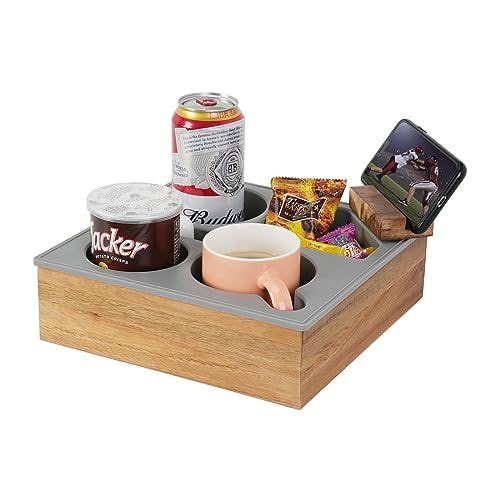 Amazon -If you're lacking space and can't accommodate a handy side table, thisbamboo trayis a clever idea. It includes two upper sections — one with channels that is perfect for glasses and mugs, and a longer one for your phone or remote. It has adjustable sides that wrap around the arm to maintain balance, and it can also be placed flat to serve as a handy table.