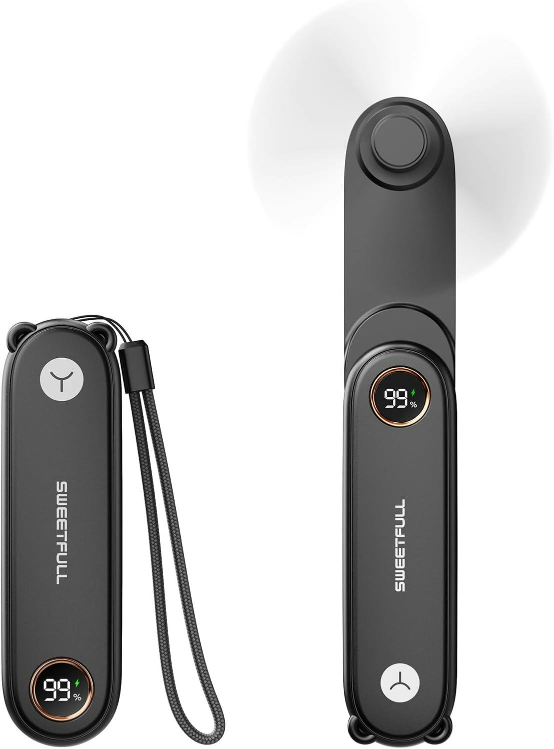 Amazon -This mini fanIt's perfect for use during camping trips, hiking adventures, or simply keeping nearby while watching a baseball game or relaxing on the beach. Featuring a foldable structure, it easily fits in your pocket, weighs only 3.42 ounces, and includes a lanyard for convenient neck wear. It offers up to 12 hours of battery life on a single charge and has a digital display to show remaining power.