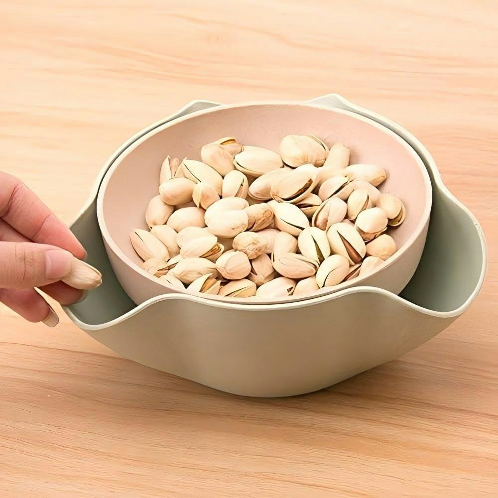A two-tiered container for serving snacks and disposing of their seeds, shells, or pods