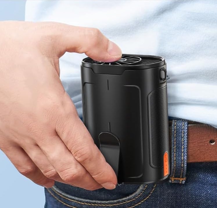 A handheld fan that attaches to your belt for convenient cooling on the go
