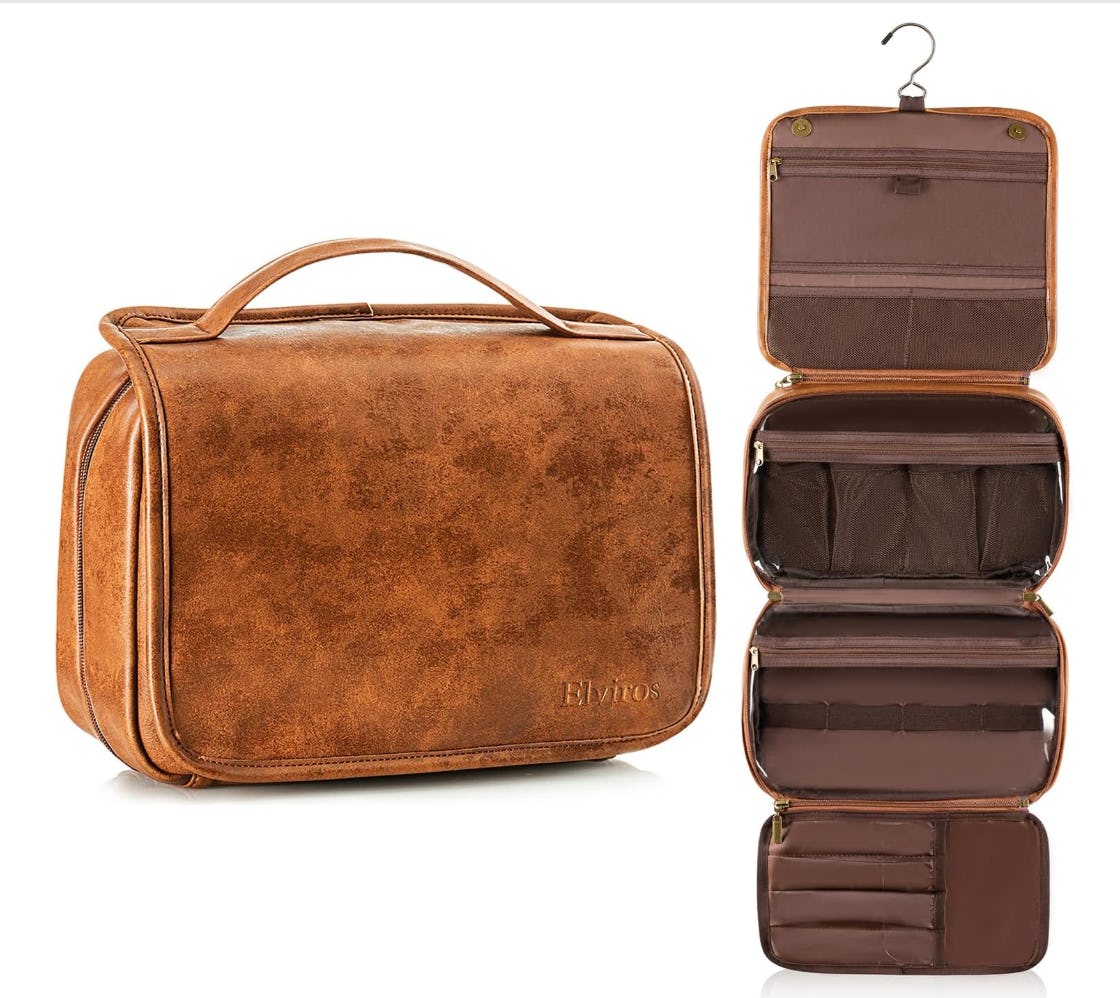 Amazon -Featuring a water-repellent synthetic leather surface that appears luxurious and refined, thishanging toiletry bagincludes three distinct zipper compartments, two mesh bags, and a space for holding brushes, combs, or shaving tools. Additionally, the larger zipper pockets come with internal mesh pockets or elastic straps to ensure bottles remain upright and neatly arranged. It also features a durable metal hook for hanging during travel, providing convenient access to all items.