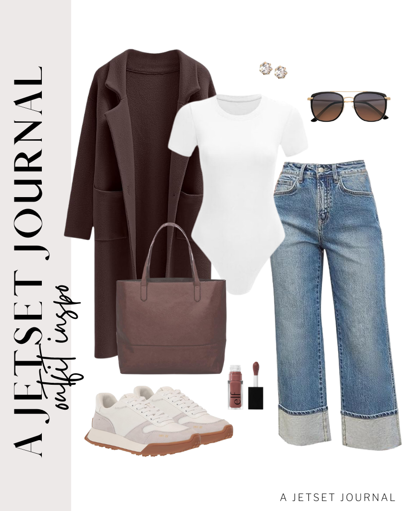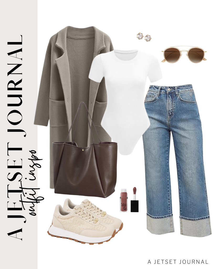 Outfit 4:I'm really enjoying this brown-colored cardigan coat worn over a white short-sleeved bodysuit and medium blue jeans. Pair it with neutral-colored fun sneakers, a large brown tote bag, and some round polarized sunglasses.