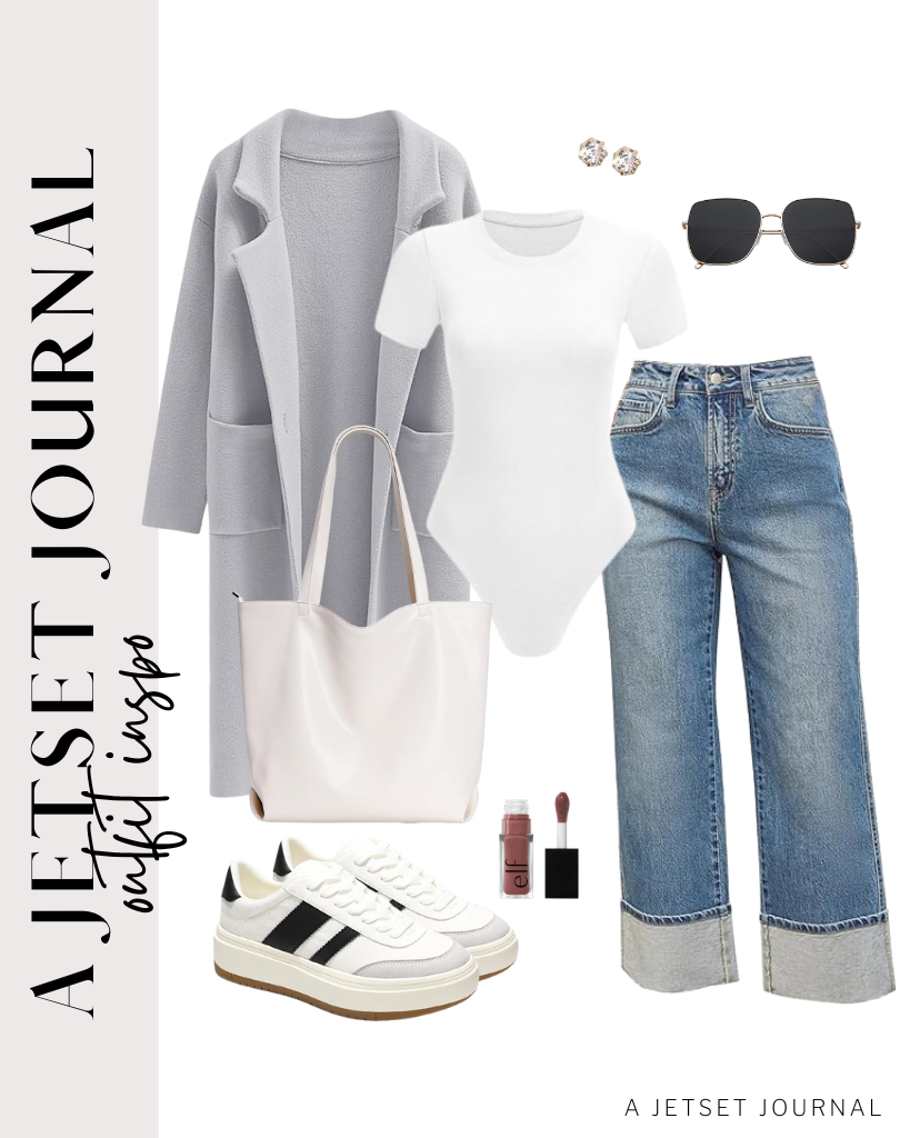 Outfit 3:I really like the light gray color choice for the cozy cardigan jacket, worn over a simple white short-sleeve onesie and high-waisted jeans. Pair it with a white shopping bag, fashionable platform shoes, and large sunglasses to finish off the outfit.