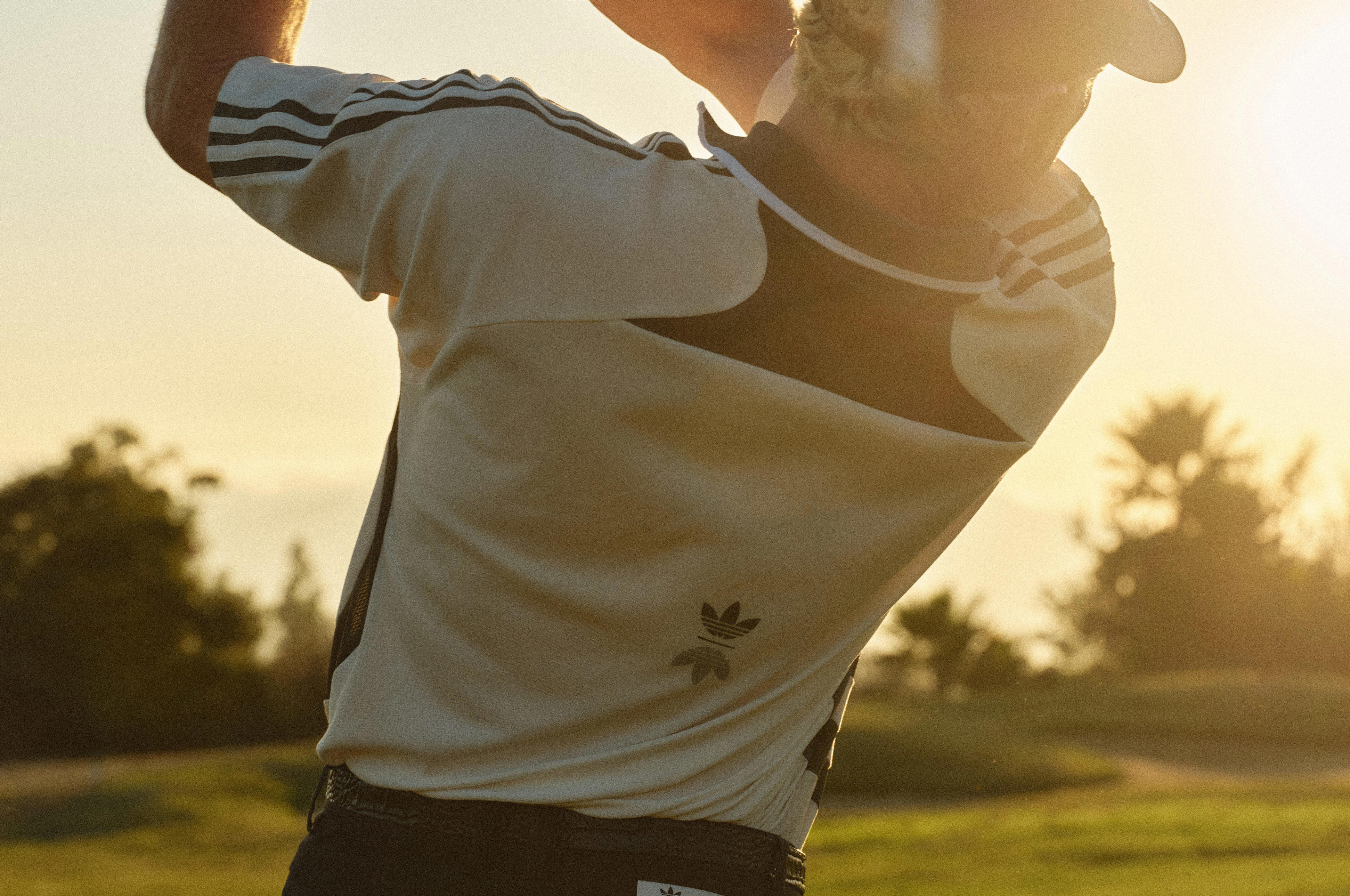 The collection features six items: a polo that subtly references the mid-2000s adidas Teamgeist soccer ball designs, a windbreaker, a hat, a glove, and the highlight piece, a golf pant with zippered leg vents that expose three-stripe details when opened.