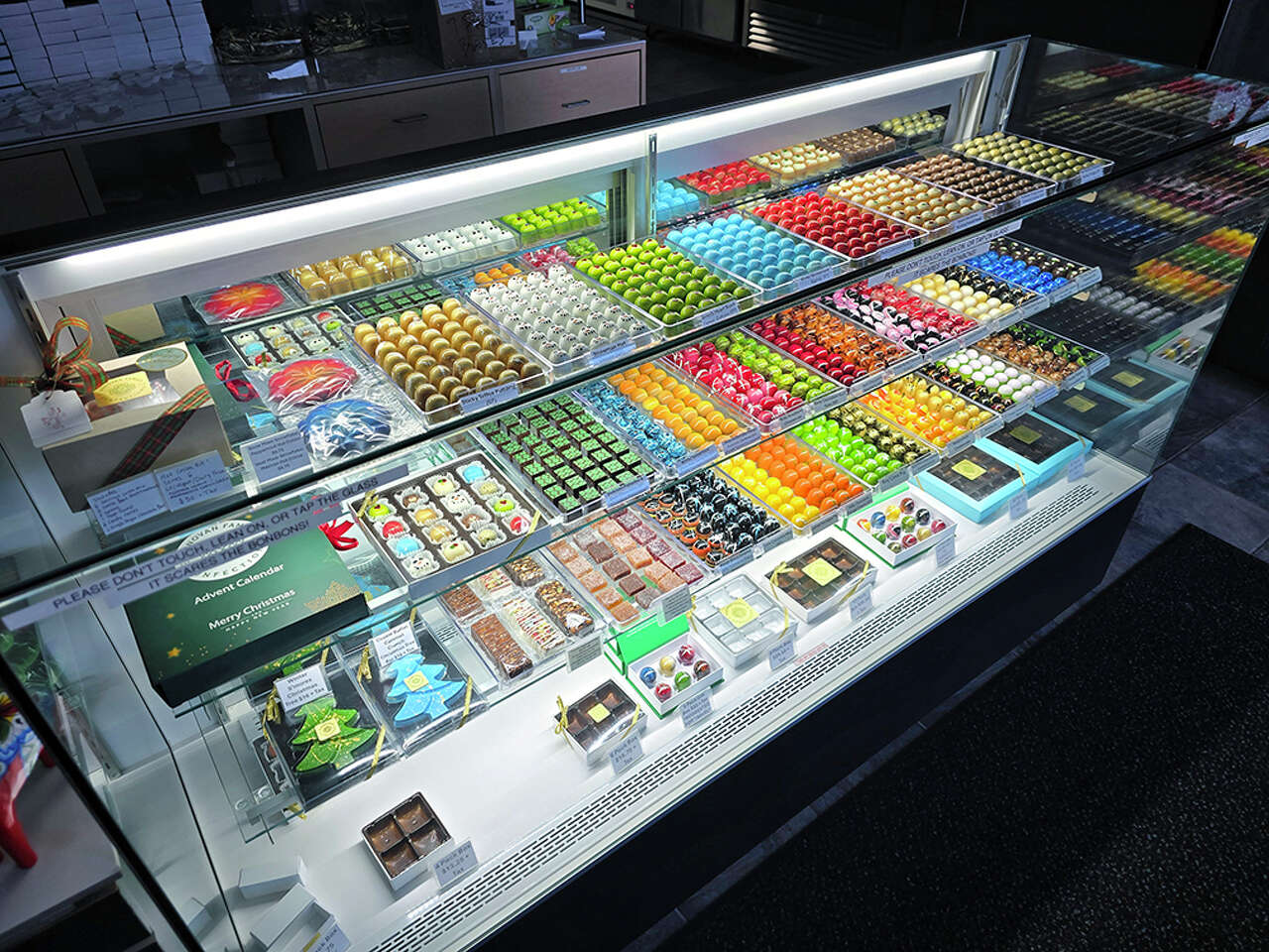 The store is famous for its vibrant bonbons, which feature delicate Belgian chocolate shells containing a range of flavors and are "painted" using various colors of cocoa butter.