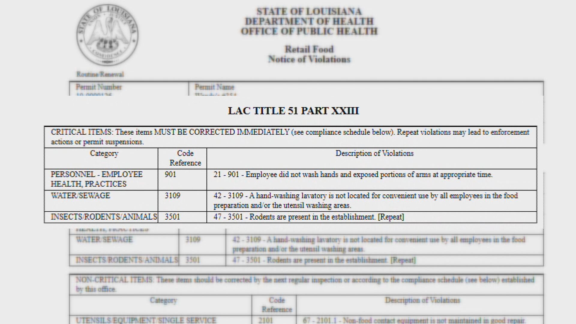 LAKE CHARLES, Louisiana (KPLC) - A health inspection conducted by the Louisiana Department of Health at the Wendy’s located in Downtown Lake Charles revealed unclean conditions, including the presence of rats.
