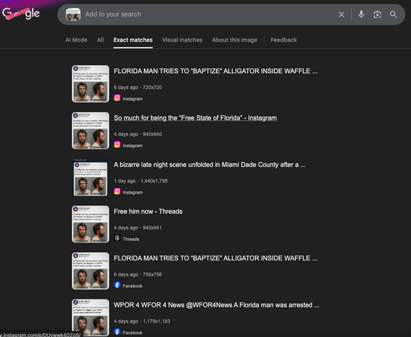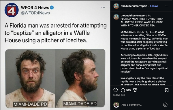 "FLORIDA MAN ATTEMPTS TO 'BAPTIZE' AN ALLIGATOR IN A WAFFLE HOUSE USING A PITCHER OF ICED TEA." Social Media. The Dude Humor Report, Facebook,https://www.facebook.com/TheDudeHumorReport/posts/pfbid023DpcqfmLbXscFHgzcGjGXCMXPJyzePkwaaqjkYwmLj5AJTMmFMMubNXSJM8EqkRal.