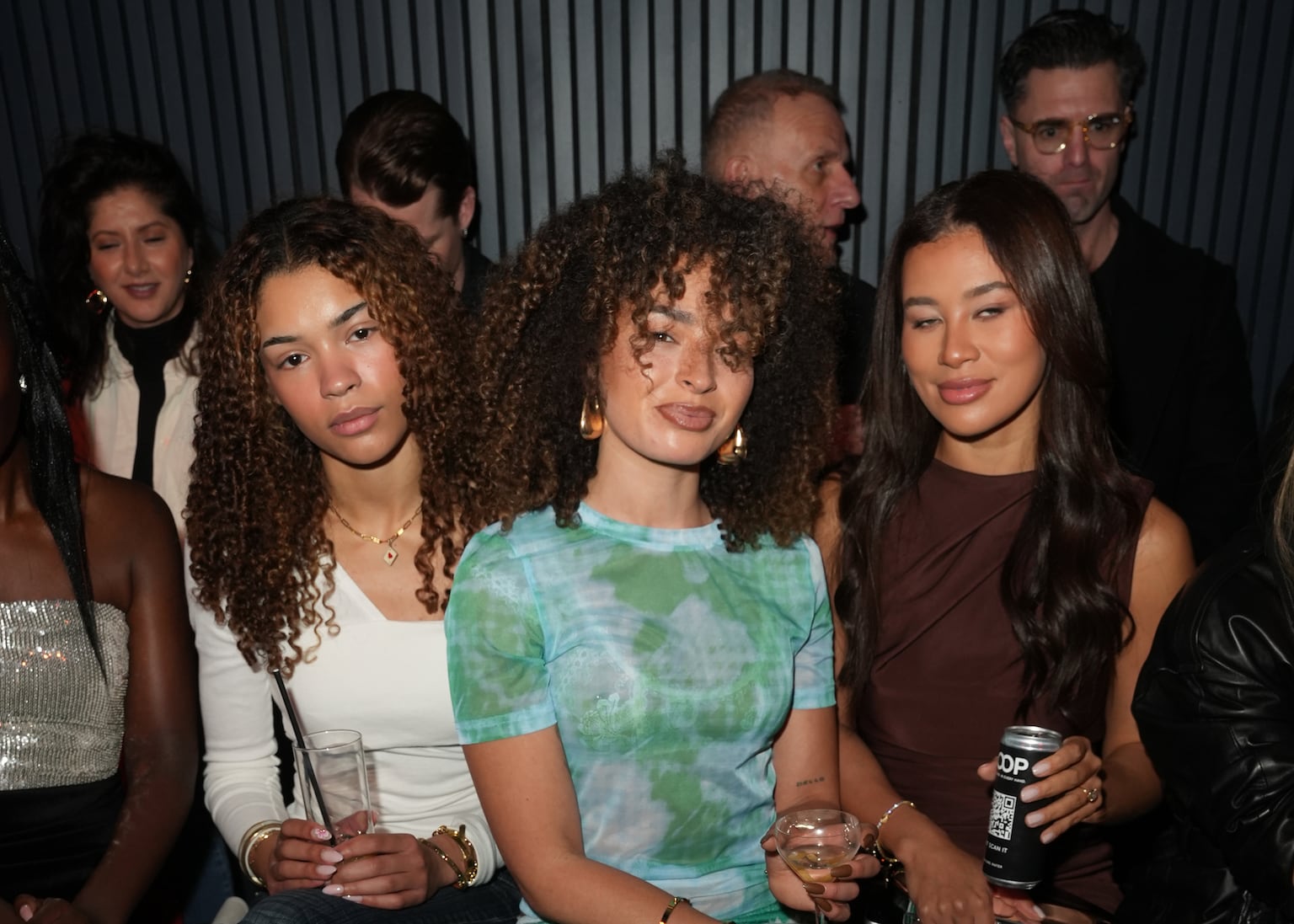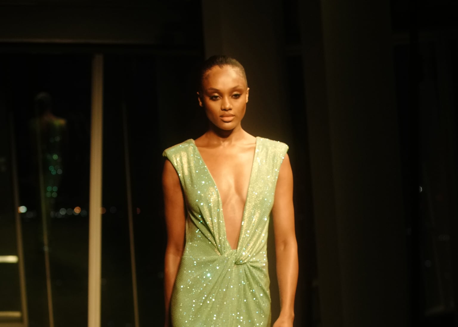 Open-back dresses, low necklines, and high-cut bodysuits were prominent, with transparent sections and clever openings appearing frequently. A light green, glitter-covered dress had a deep V-neckline that was gathered at the waist and a front slit that showed a hint of leg, combining red-carpet elegance with a relaxed, beach club vibe.