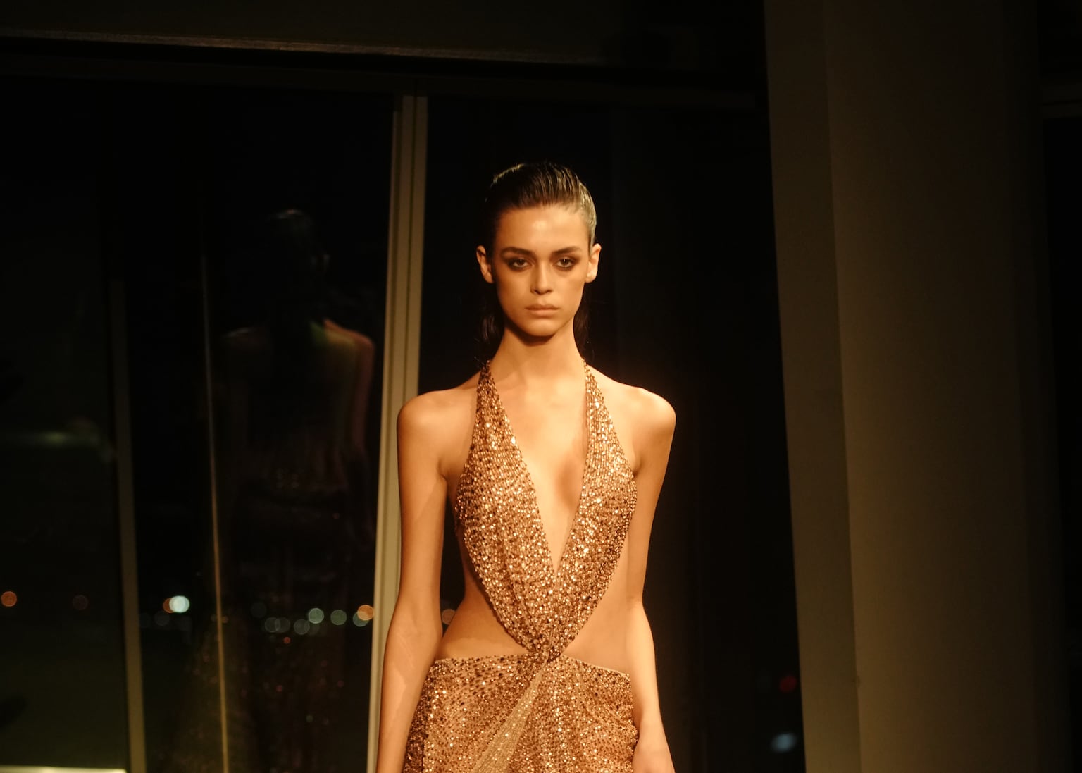 Sequins were used extensively throughout the collection. A sharply tailored, long-sleeved column dress in burnished bronze caught the light under the stage lights, with its structured shoulders highlighting Macdonald’s signature tall and elegant look.