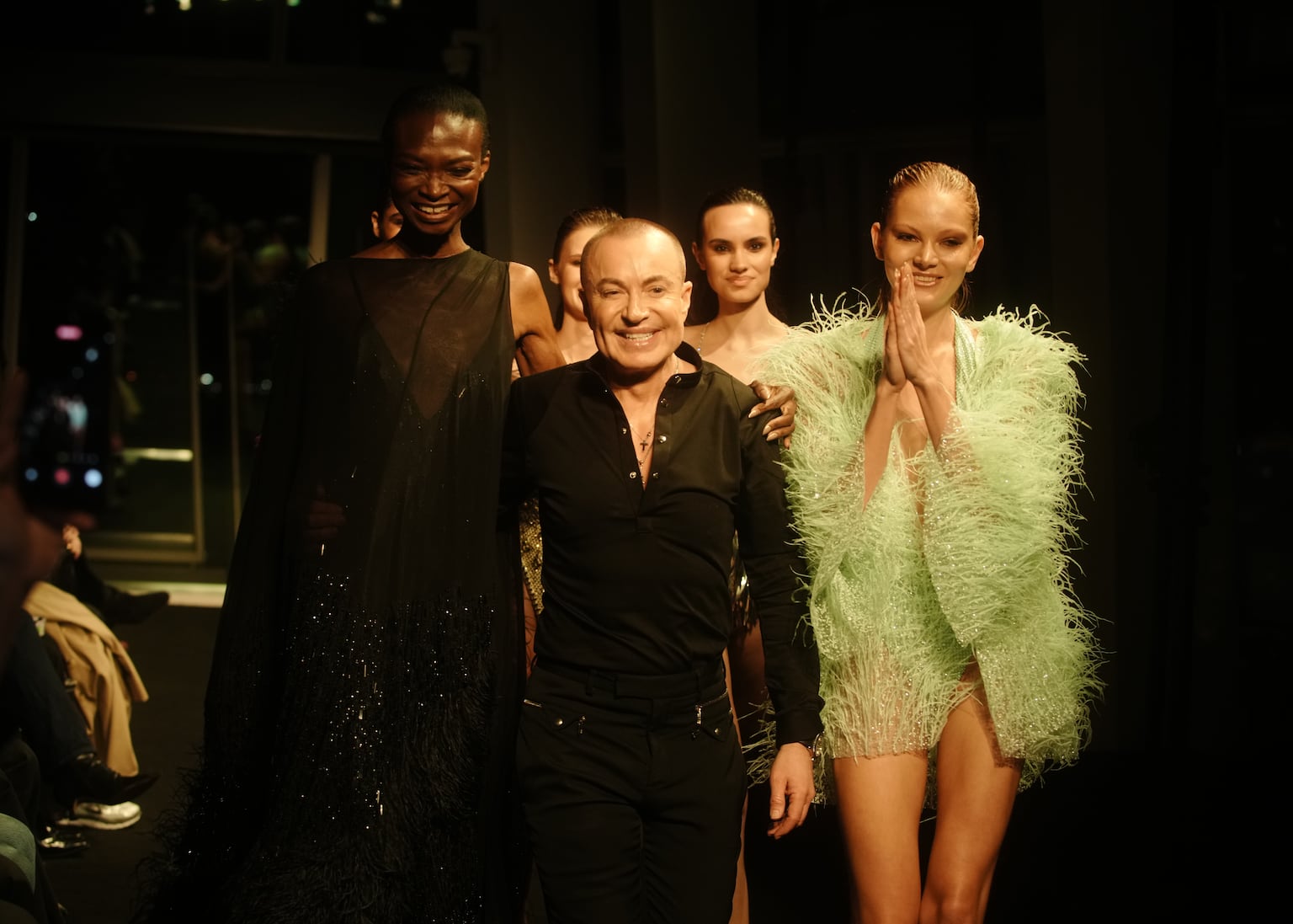 From a different perspective, a black sheer dress with feathered hem details flowed down the runway, combining see-through elements with fluid motion.