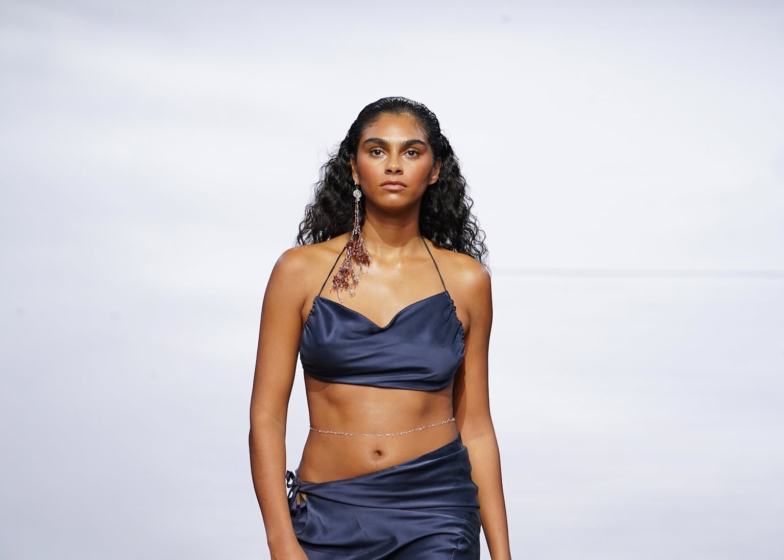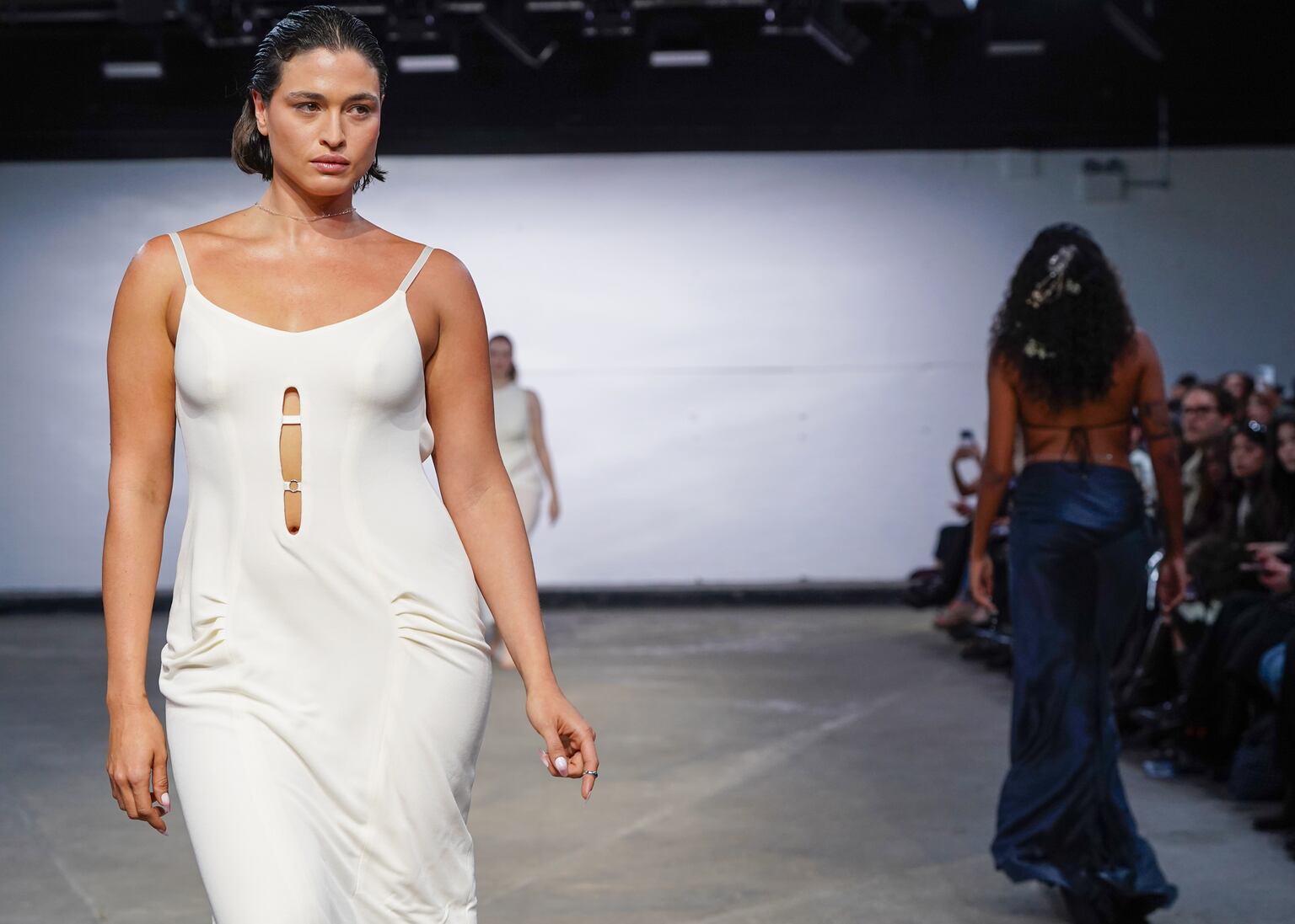 A designer who was born in Brazil showcased a runway collection featuring models with noticeable size variety, ranging from XS to more voluptuous figures, all dressed in the same flowing, form-fitting styles.