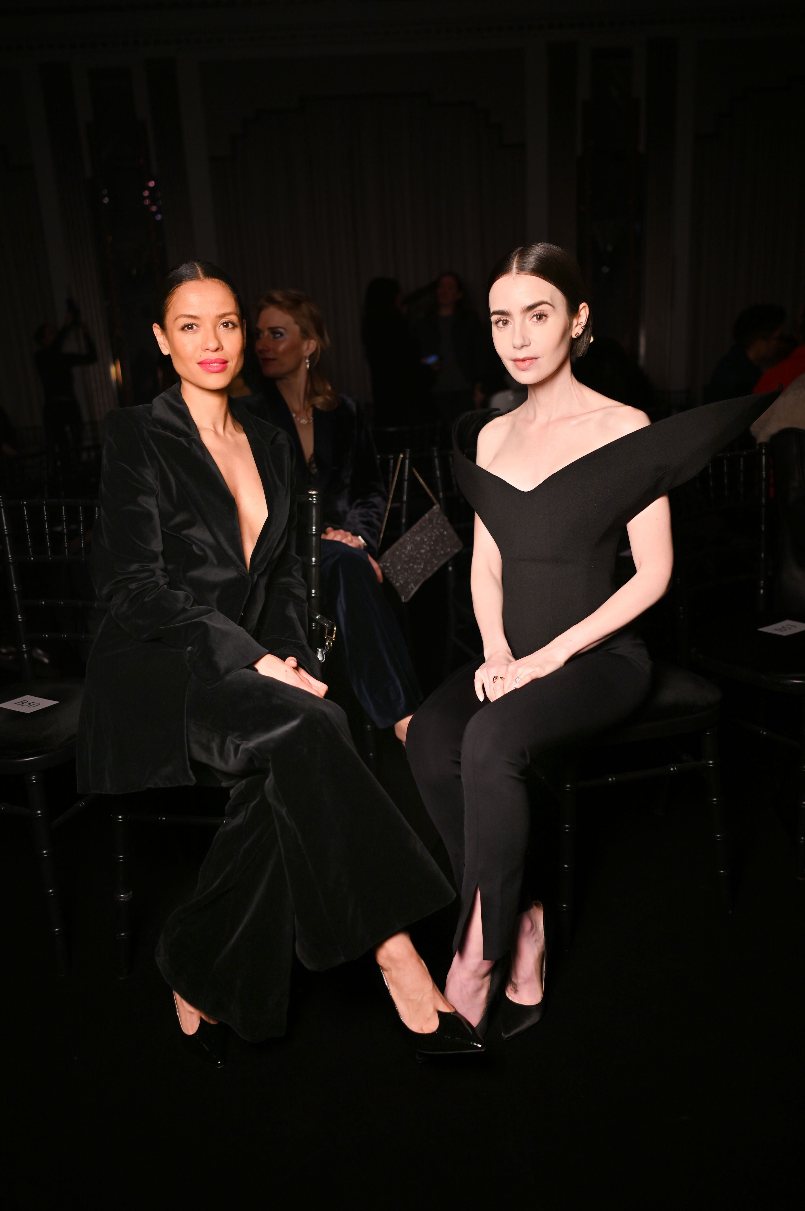 Emily In ParisStar Lily Collins made an uncommon appearance in the front row at Harris Reed's AW26 fashion show, which took place in the grand ballroom of Claridge's. The actress donned a bold black bustier created by Reed for the event and was accompanied by celebrities such as Gugu Mbatha-Raw, Joe Locke, and Nicky Hilton Rothschild.