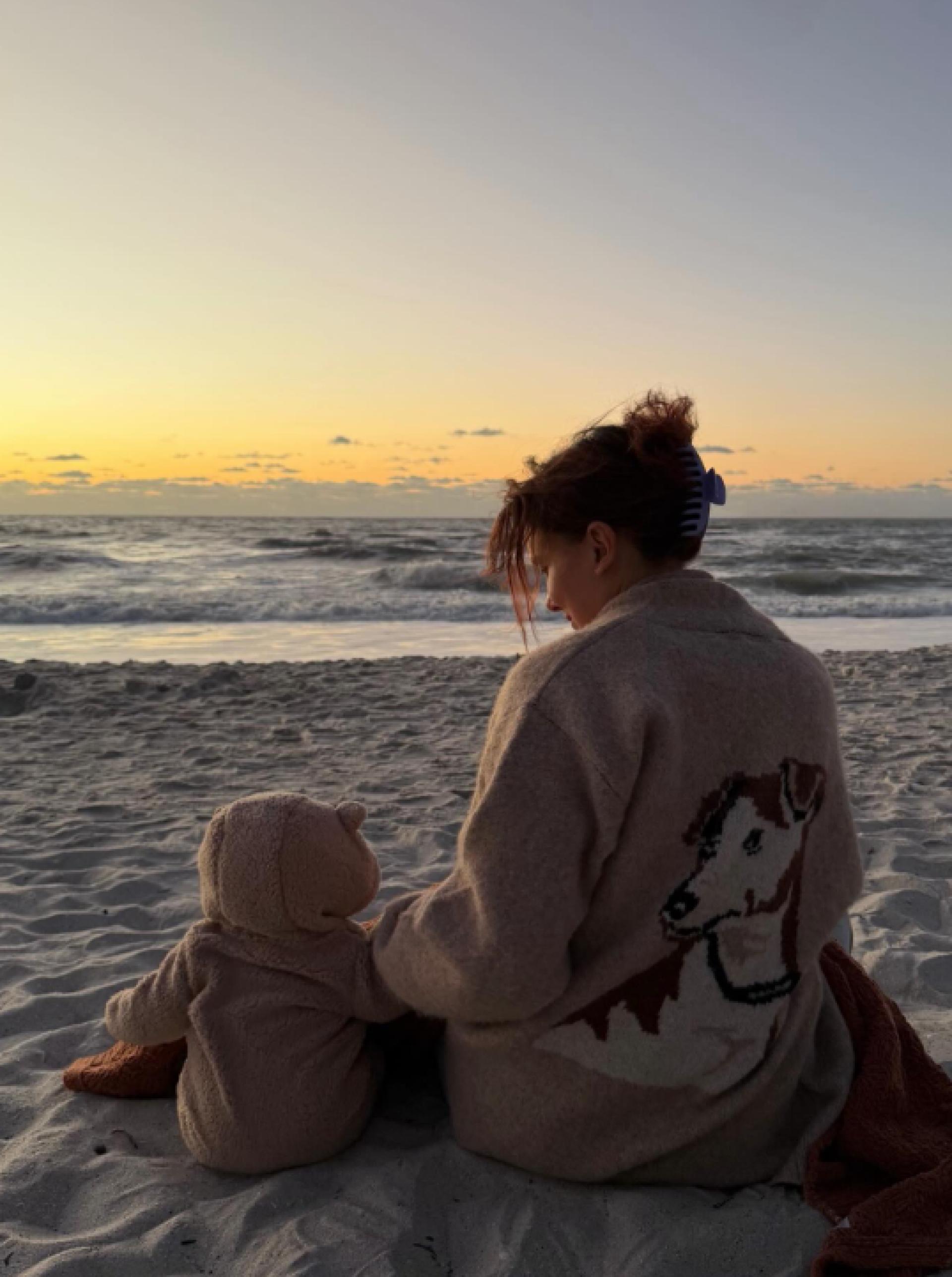The image captures the mother and daughter wearing comfortable clothing as they sit next to each other on a sandy shore, taking in the sunset. The actress gazes at her young daughter with a soft smile.
