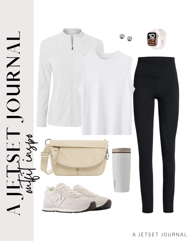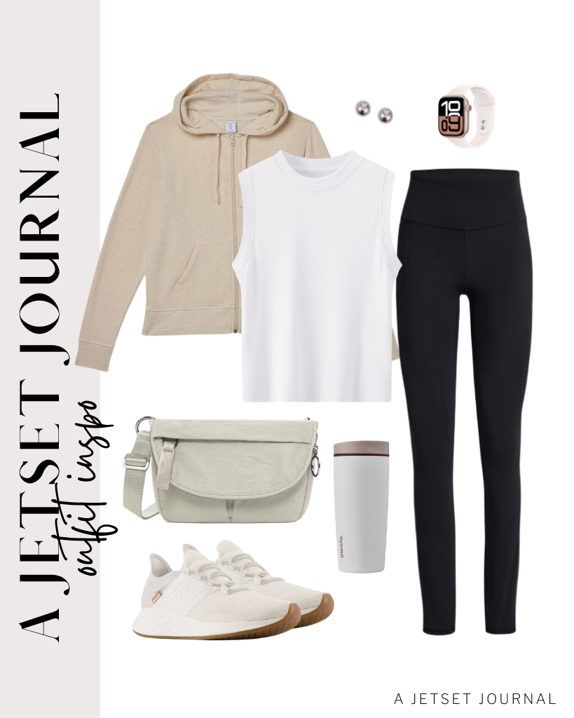Outfit 1: Let's be honest, nothing surpasses neutral pieces. Begin with a fundamentalribbed knit form-fitting white top and high-rise stomach control black leggingsto make it straightforward. Expand on thisOatmeal French terry fleece full-zip sweatshirtI love how it flows smoothly without being too heavy. Complete the look with these New Balance sneakers in paper white/gum color.