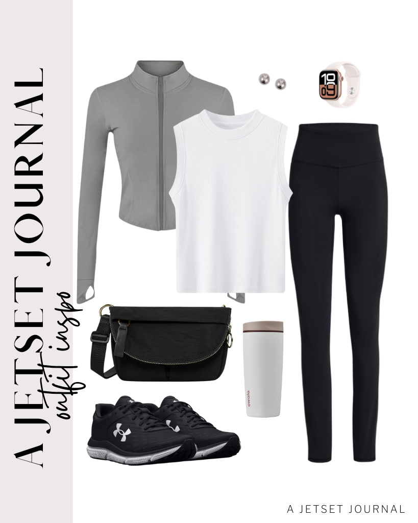 Outfit 3: For a more streamlined look, I suggest this option.gray slim-fit running track jacketon top of the white tank and black leggings. This jacket provides a more snug fit that accentuates your curves in the appropriate areas while still utilizing a breathable fabric so it doesn't hinder your mobility. Complete the look with theseblack Under Armour Charged Assert 10 shoesand you could find your new favorite for daily fashion and ease.