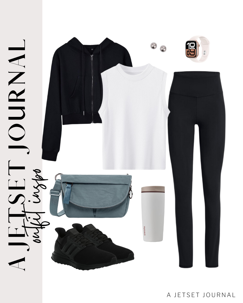 Zip Up Hoodie / adidas Women's Ubounce DNA Footwear / Tank Top / High-Waisted Leggings / Apple Watch / Mini Crossbody Bag / Owala Coffee Tumbler / Stud Earrings