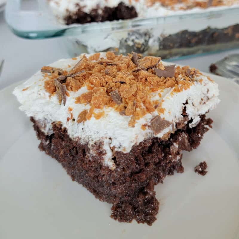 If you couldn't figure it out, we're really fond of our candy-themed treats! This recipe uses the poke cake method to allow the crushed Butterfingers to melt and gather while baking in the oven, and Cool Whip creates a solid base for the topping, making it easier to slice and enjoy. Plus, using a chocolate cake mix is a smart time-saver, reducing the number of ingredients to just five basic pantry items.