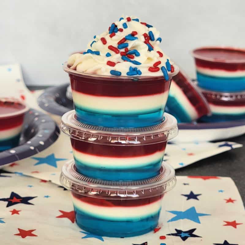 Sweetened condensed milk, vodka, and Jello are the key ingredients for creating these red, white, and blue, Fourth of July-themed layered shots. Although they are often presented in shot glasses, we find plastic shot cups more convenient and easier to drink from. If you'd like a different flavor than vodka, coconut rum is an excellent alternative.