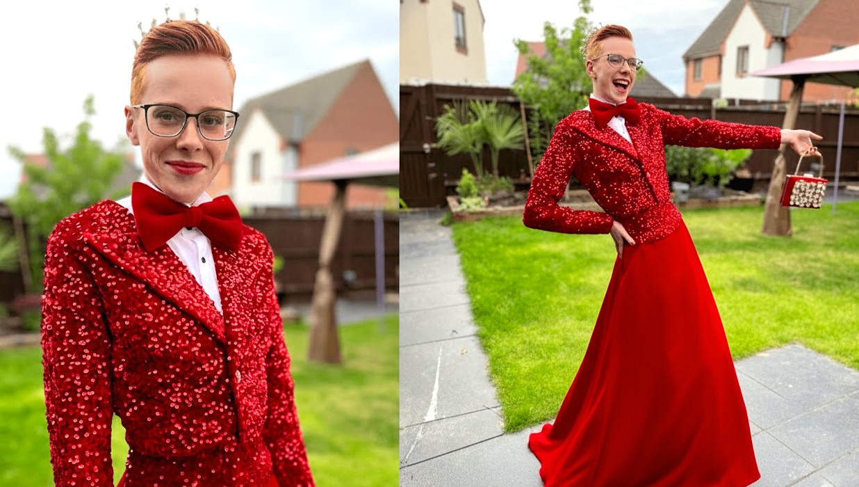 A 16-year-old named Korben White made a bold entrance at his prom wearing a flowing red ballgown that immediately drew eyes. The clothing combined elements typically associated with both male and female styles: a striking red skirt matched with a tuxedo-inspired top decorated with sequins. His vibrant red hair added to the eye-catching appearance.