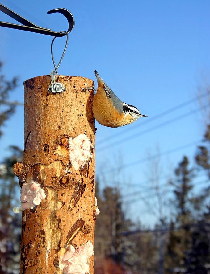 Whether you make your own suetor purchase it, a suet block placed in a cage-style feeder is certain to draw nuthatches. During the winter season, when conifer seeds can be limited, red-breasted nuthatches may venture out to find food and are likely to visit feeders for a suet treat. Addpeanut butterto your homemade suet blend and white-breasted nuthatches will enjoy it even more!