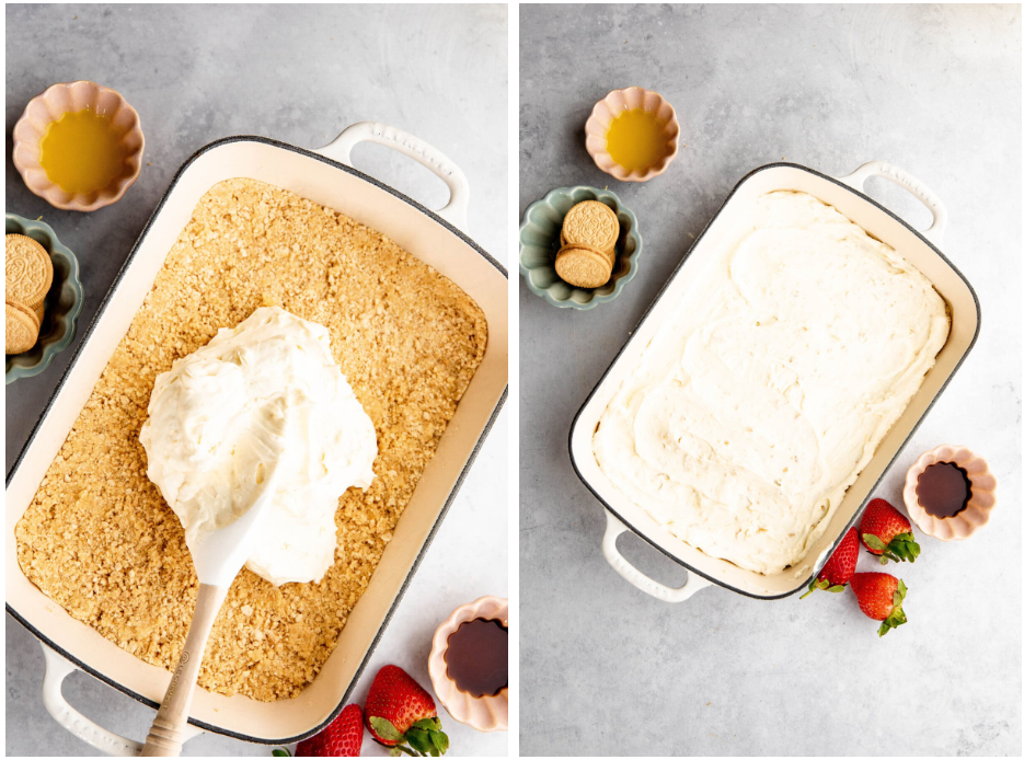 Crush the golden oreo cookiesinto small pieces using a food processor or a rolling pin. Place into a bowl and mix inmelted butterUntil thoroughly mixed. Press into the base of a 9×13 glass baking dish. Chill.