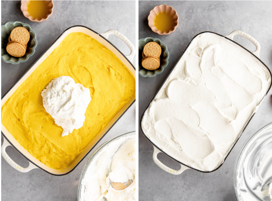 Mix together cold milk and instant lemon pudding mixFor 2 minutes, or until fully mixed. Pour onto the second layer before it fully hardens and spread it out evenly. Cover and place back in the refrigerator.