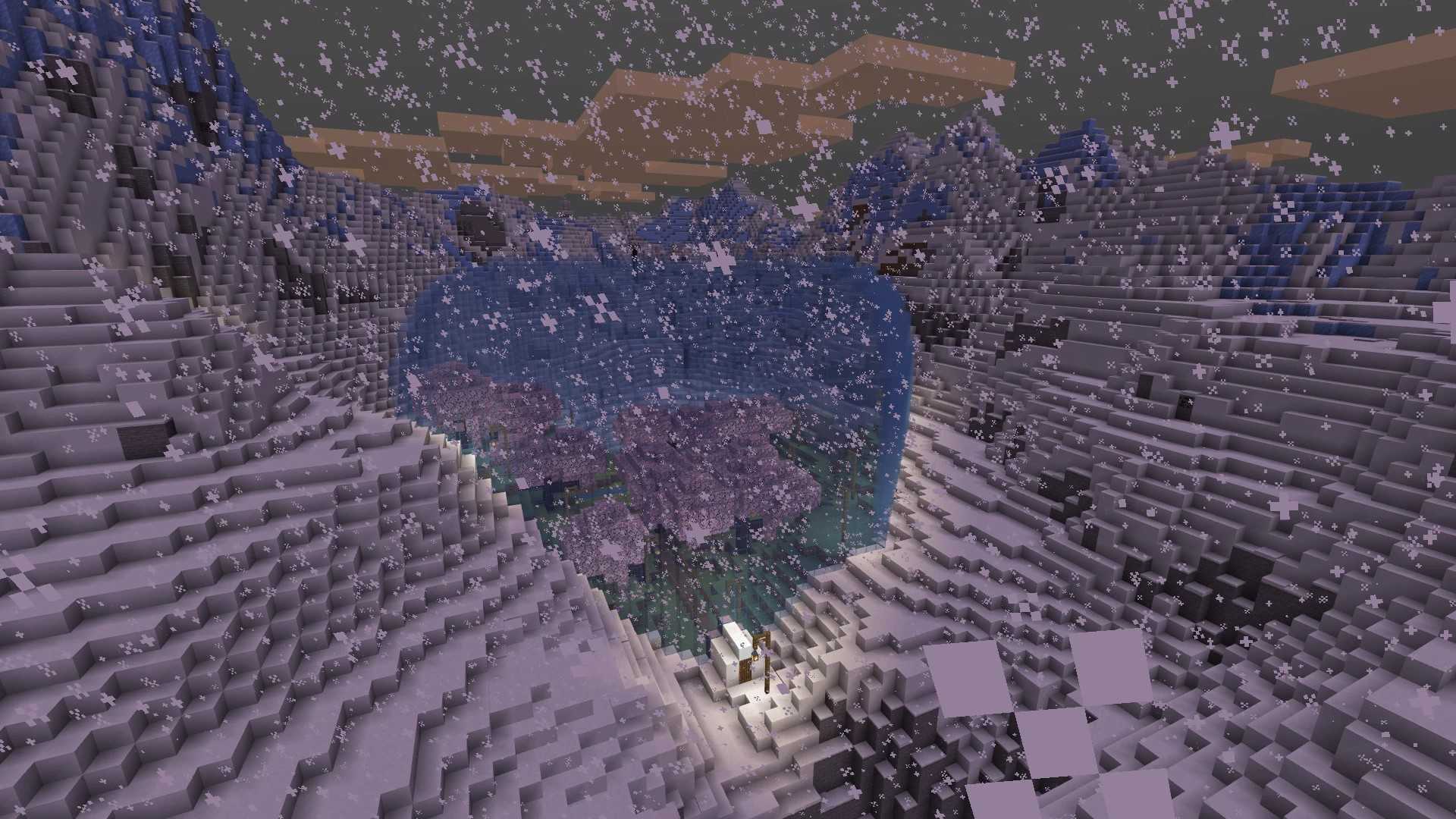 An icy mountain range protects a crater you spawn in for this Minecraft seed, filled with Cherry Blossom trees in a secluded valley. This small forest offers you a taste of the biome but also gives you plenty of resources to work with at the start. Several caves along the snow-capped peaks are great places to explore for more materials.