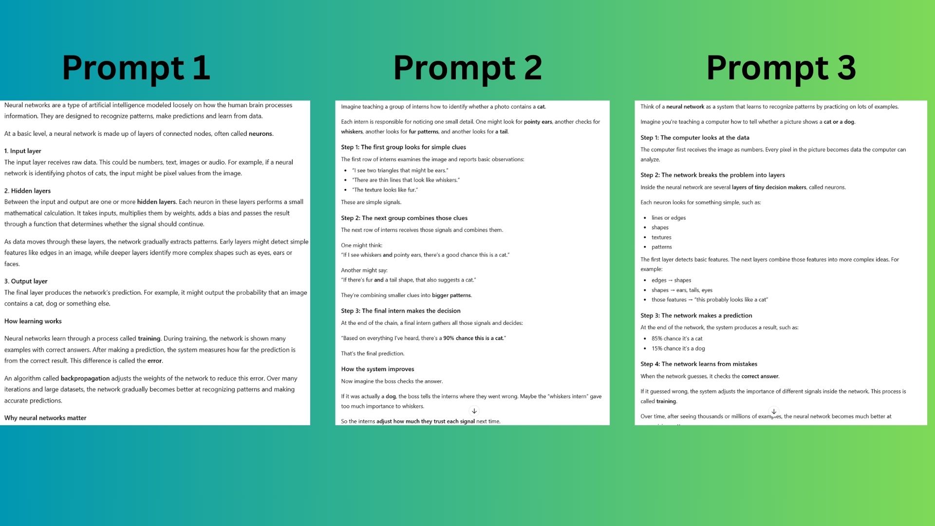 To see how well this method works, I tried the 3-prompt rule on a complicated subject: neural networks, the technology behind many modern AI systems.